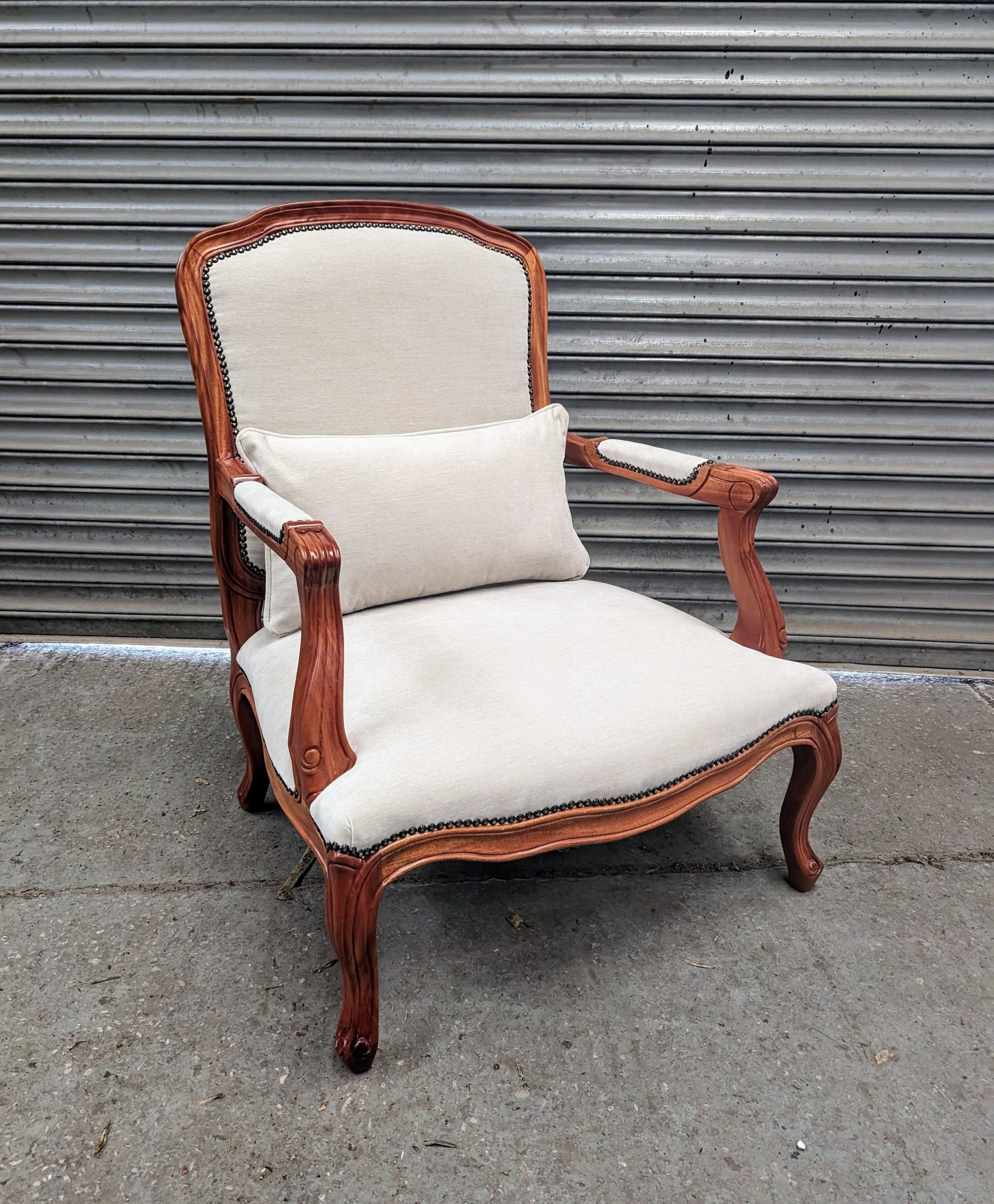 Our Louis Bergere Chair Frame offers a timeless foundation for creating a classic armchair with understated elegance. Handmade from strong mahogany, the frame is designed so that its graceful lines remain visible once upholstered, allowing the natural beauty of the wood to complement your chosen fabric and finish.